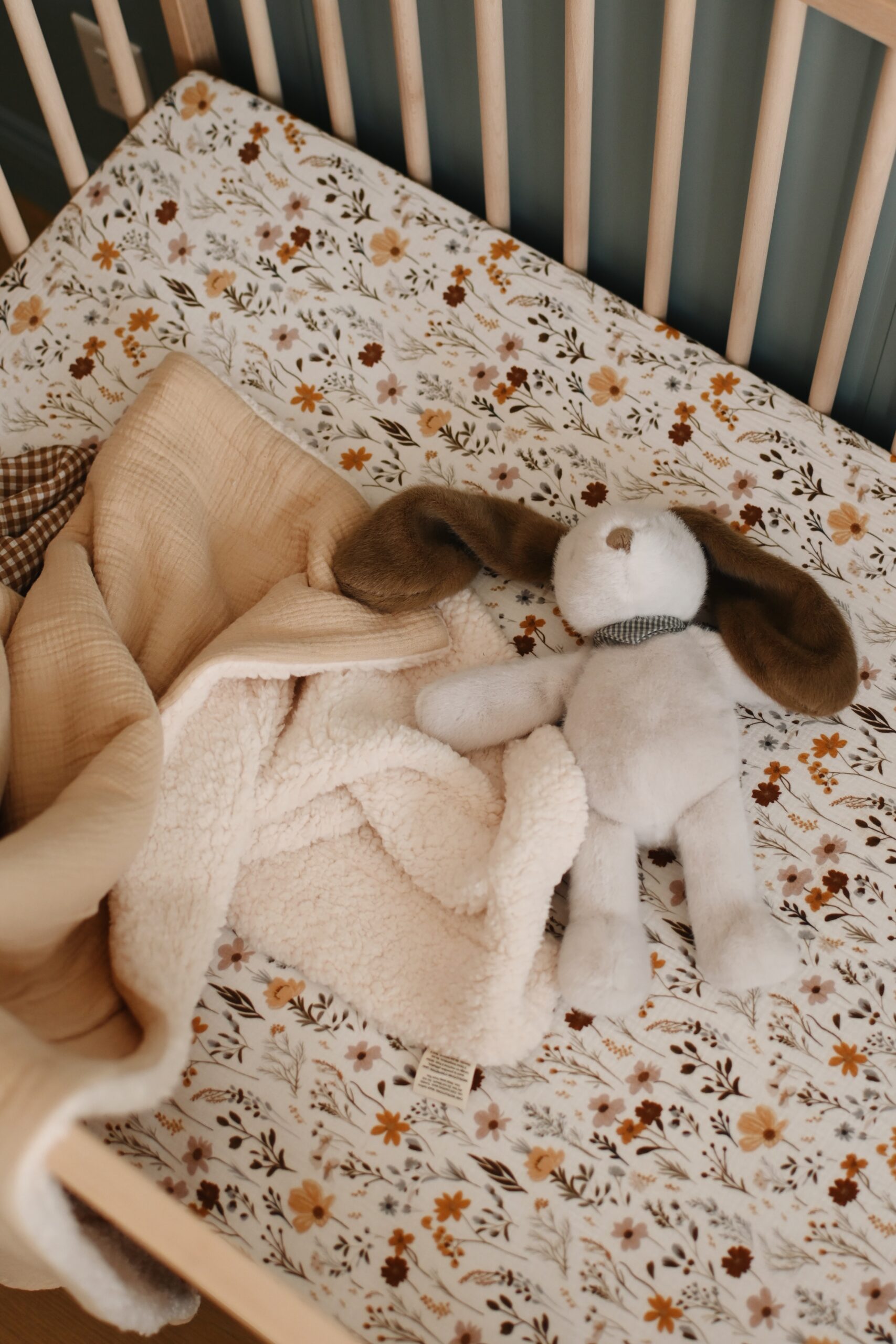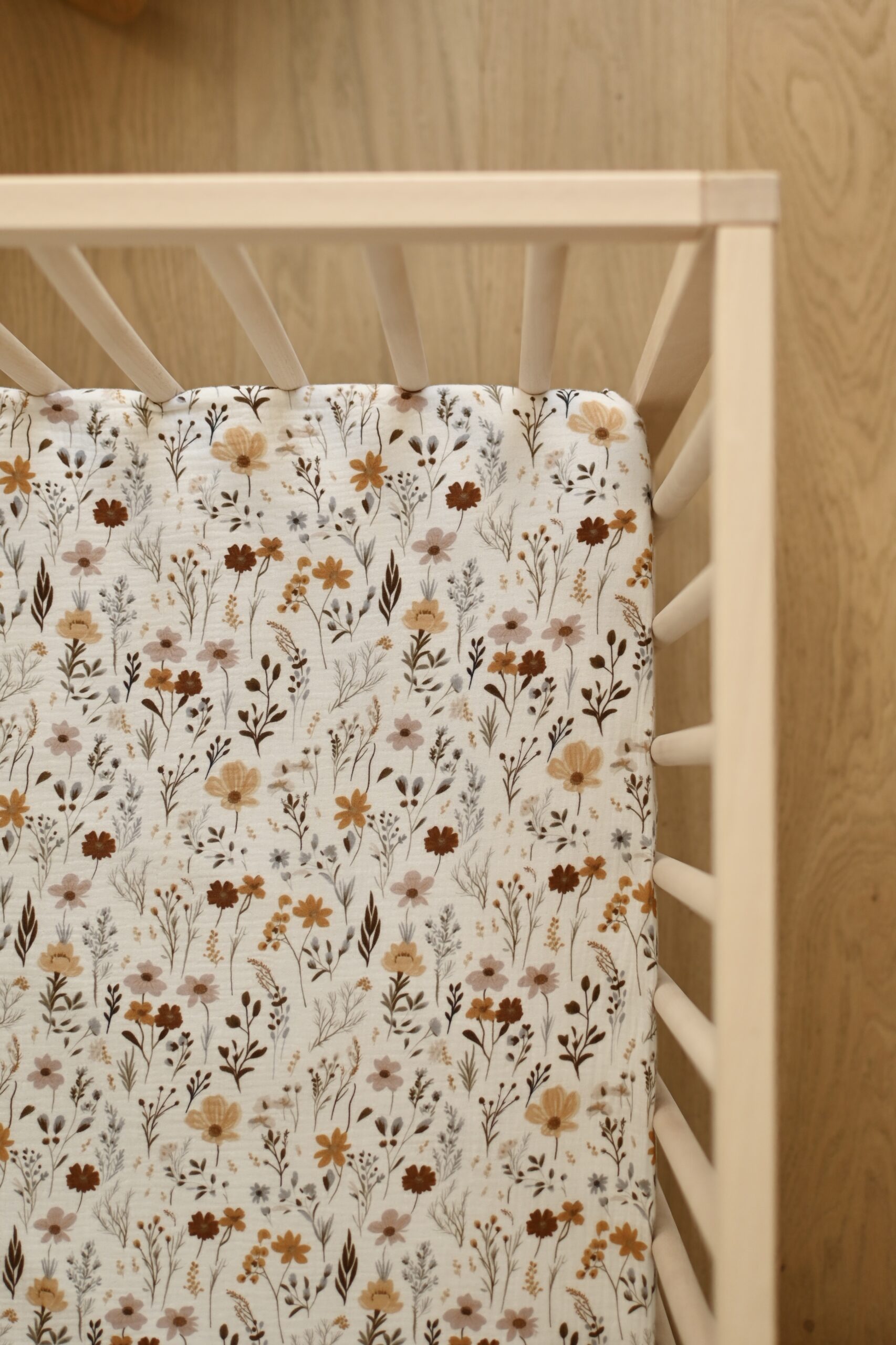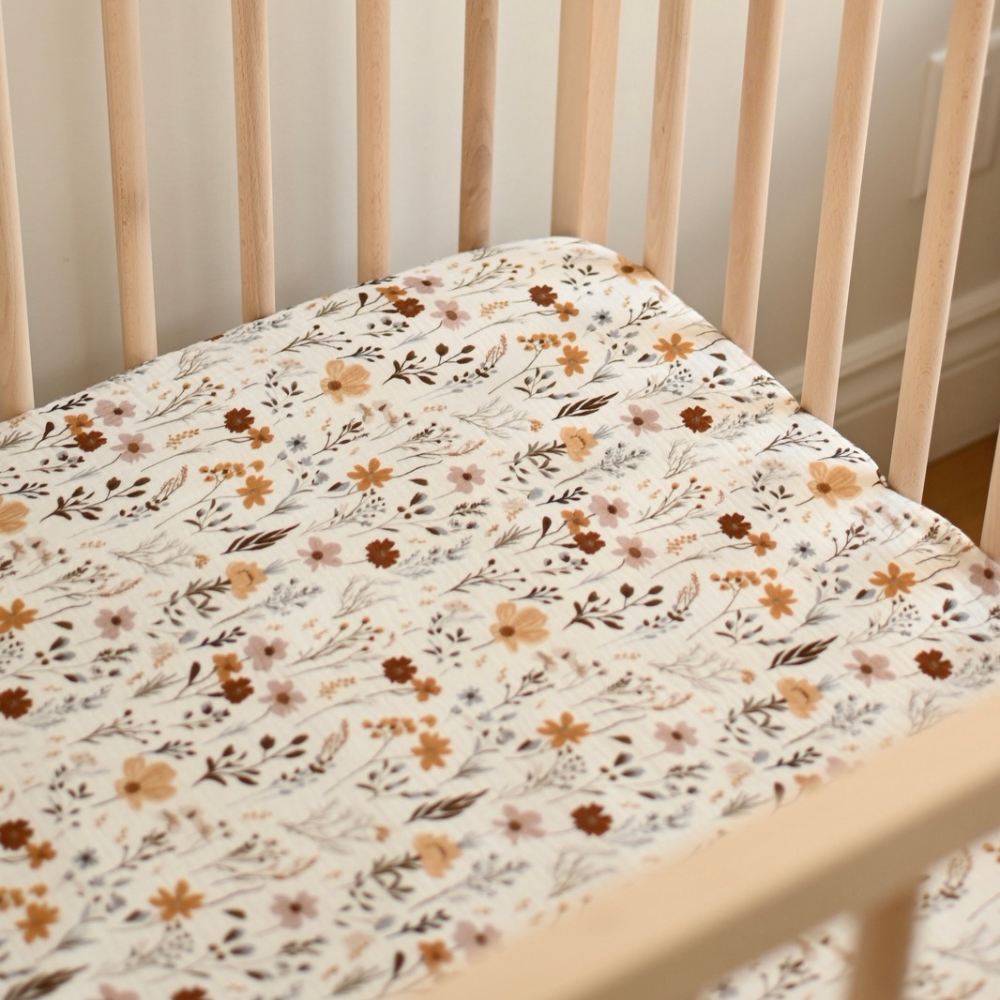 סדין למיטת תינוק בהדפס פרחוני רומנטי. עשוי 100% כותנה אורגנית. בד נושם. ניתן לכביסה ידנית או עדינה עד 30 מעלות.