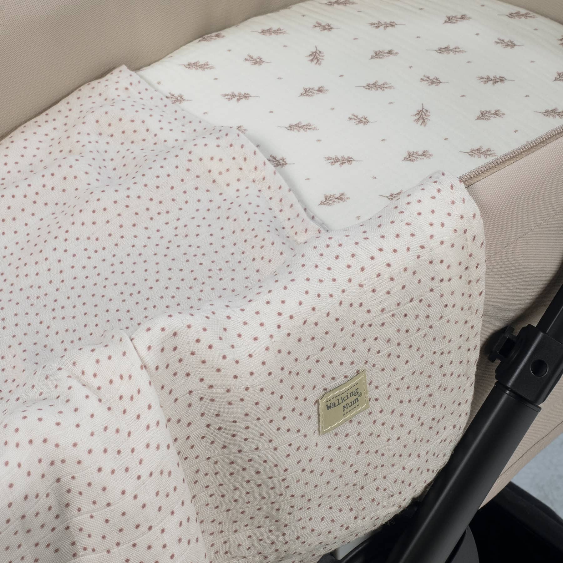סט של סדין לעגלה וטטרה בעיצוב קוקלציית mimosa בגווני ורוד. 100% כותנה. יש לכבס כביסה ידנית או כביסה עדינה עד 30 מעלות.