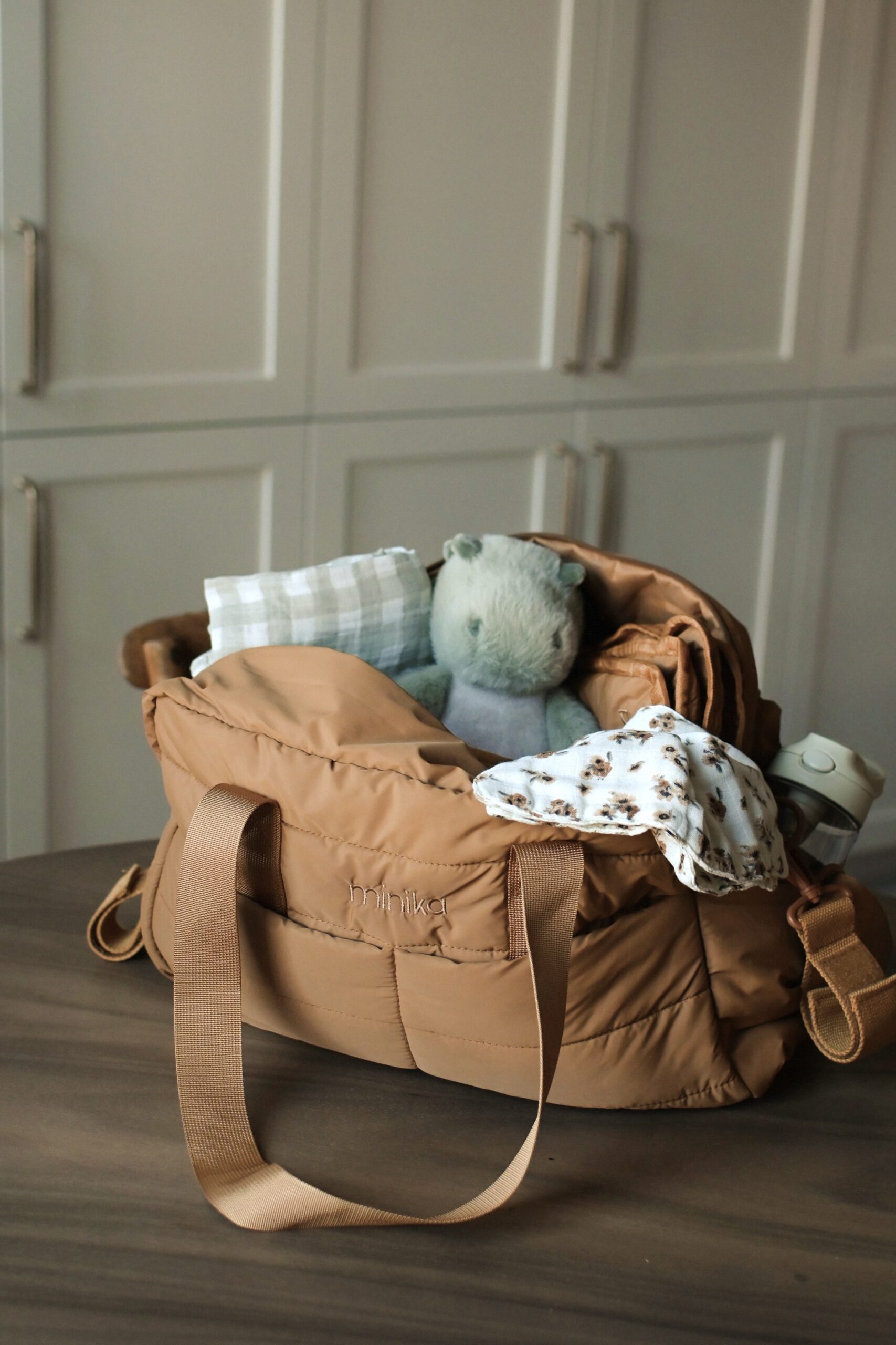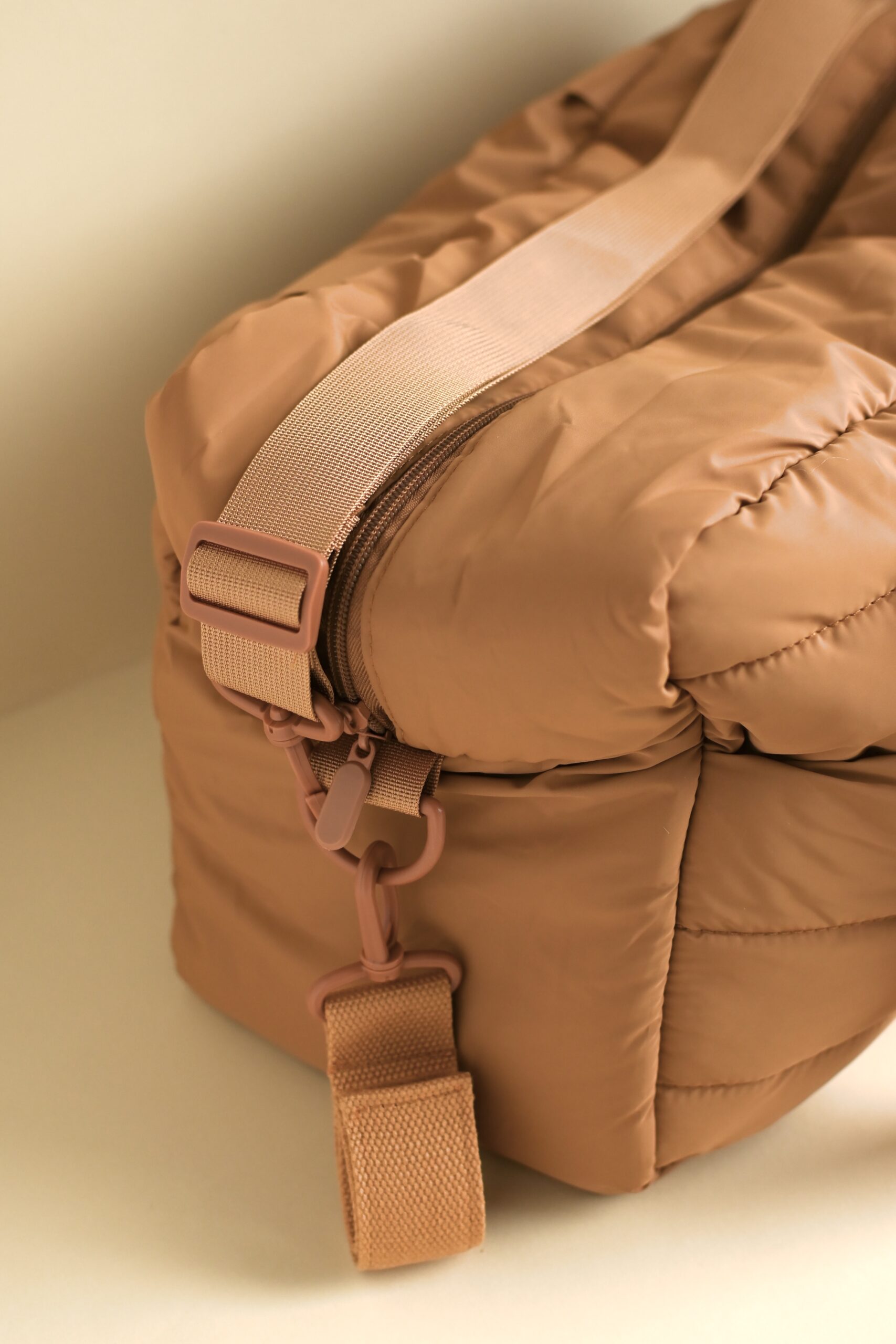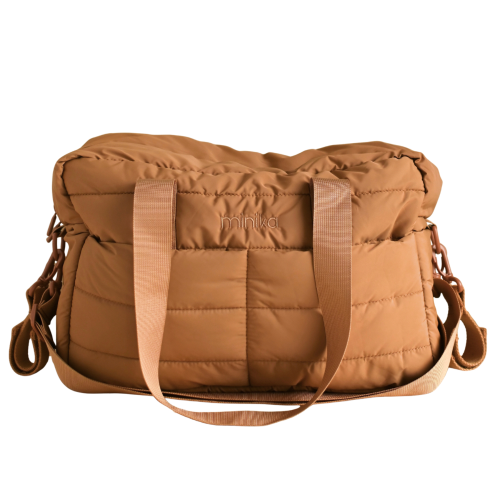 תיק לעגלה מושלם לך ולבייבי שלך. תיק עשוי ניילון ופוליאסטר בעיצוב נפוח בצבע כאמל עם תאים פנימיים ותא פנימי שומר טמפרטורה לבקבוקים. בעל תאים חיצוניים מקדימה ומאחורה ותא חיצוני נוסף לבקבוק. מיוצר מבד איכותי ועמיד לנוזלים. לתיק רצועה לנשיאה על הכתף ורצועות נשלפות לתליה על העגלה