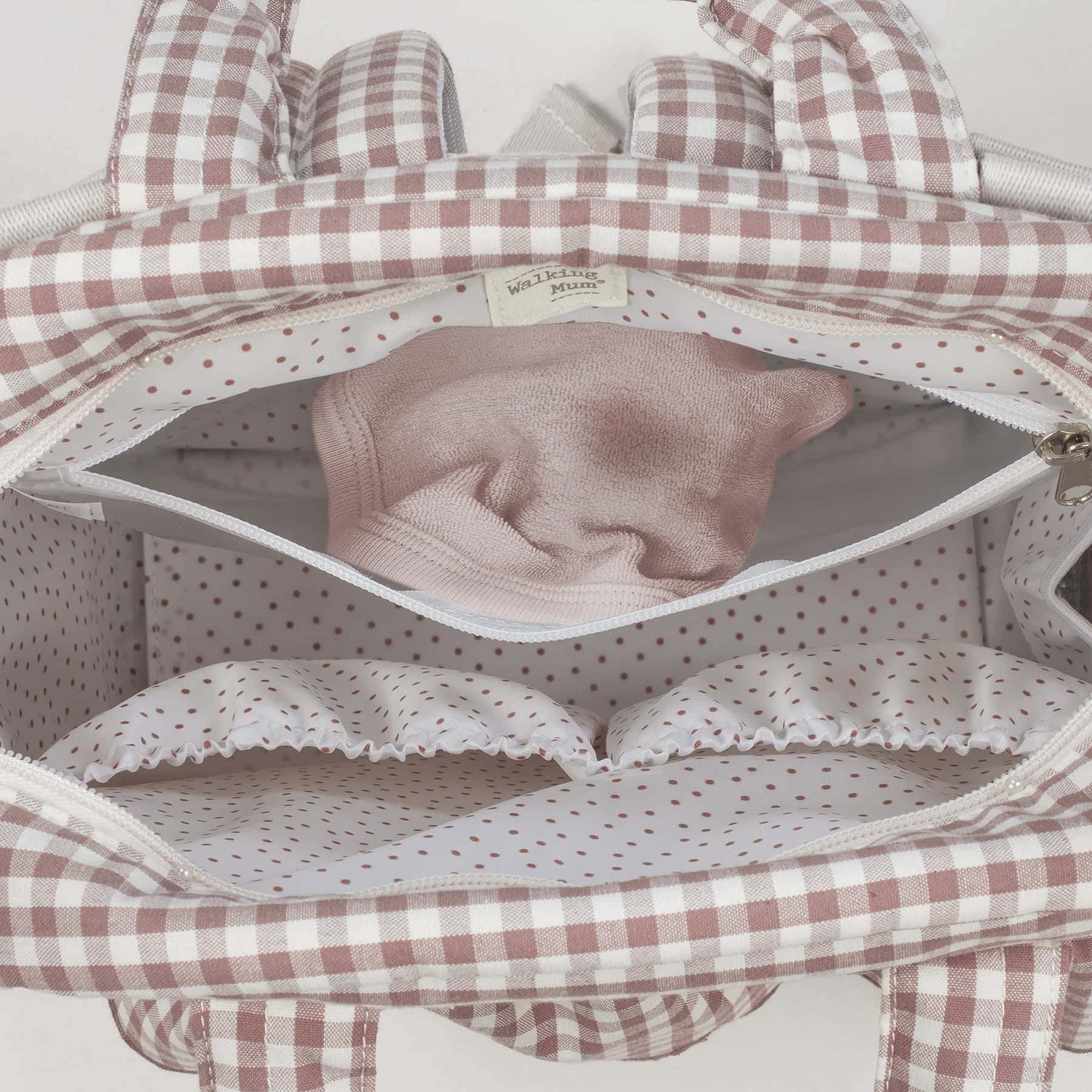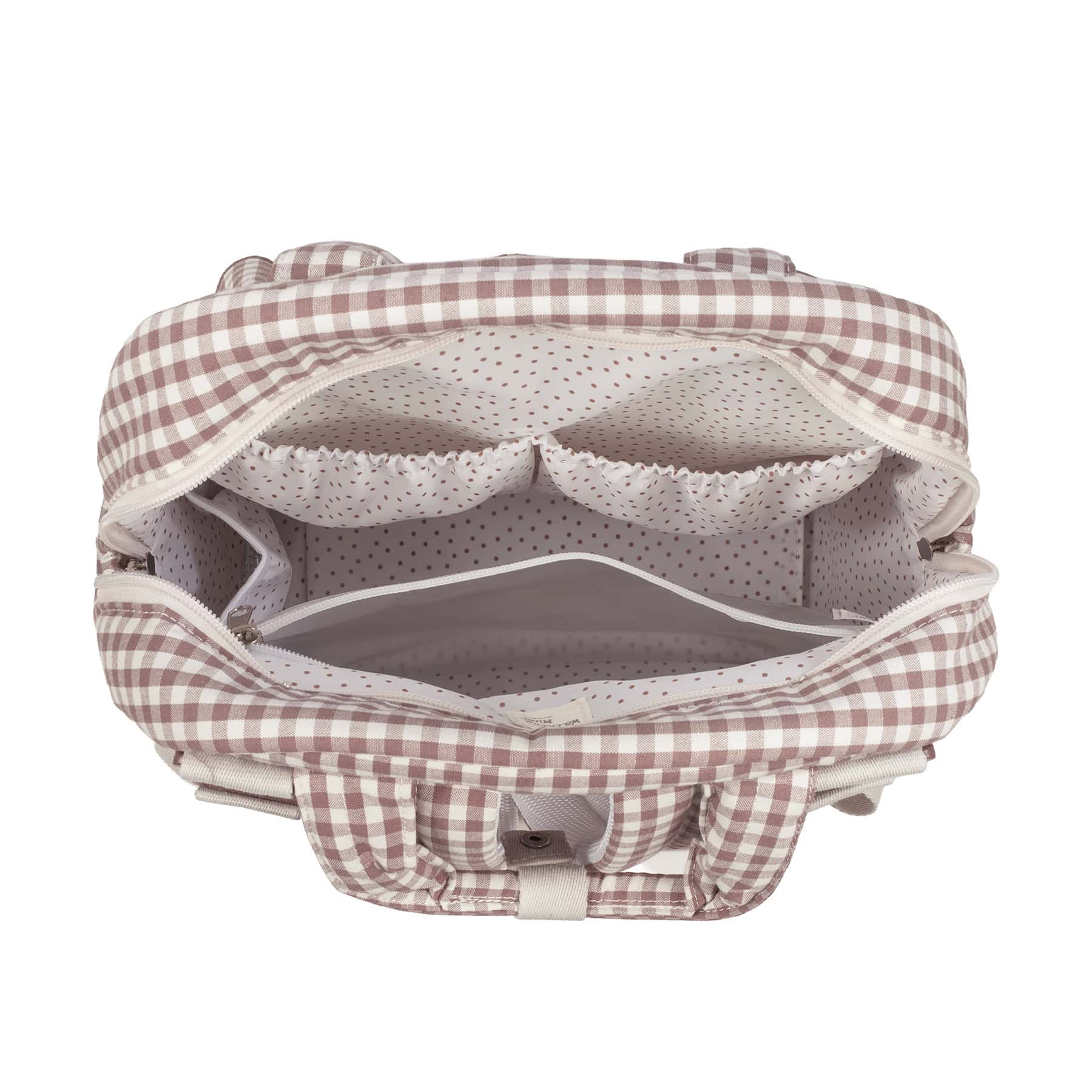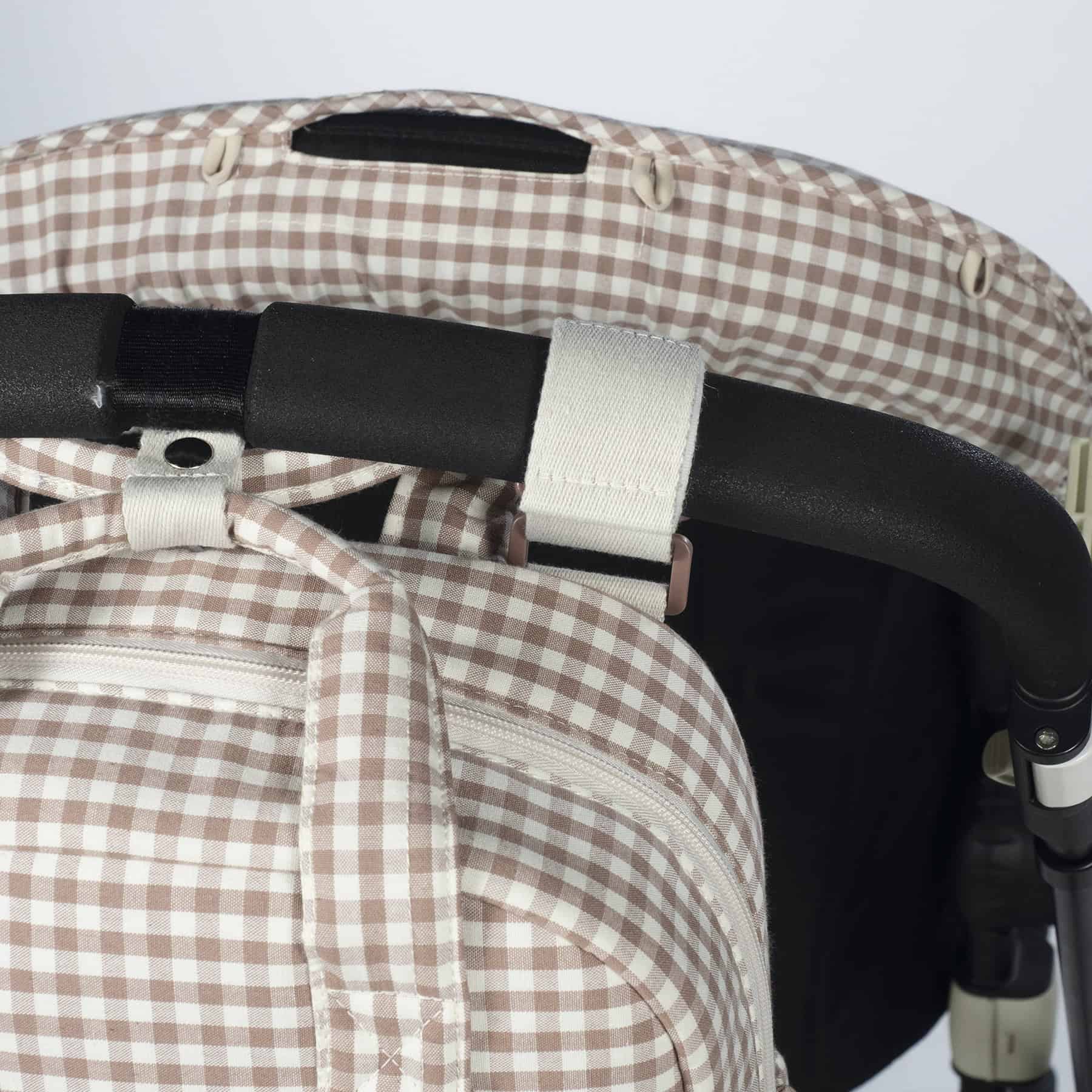 תיק גב לעגלה מושלם לך ולבייבי שלך. תיק בעיצוב משבצות עדין בגווני ורוד חום בקישוט מלמלה עם תאים פנימיים וחיצוניים. מיוצר מבד איכותי ועמיד לנוזלים. לתיק רצועות לנשיאה על הגב.