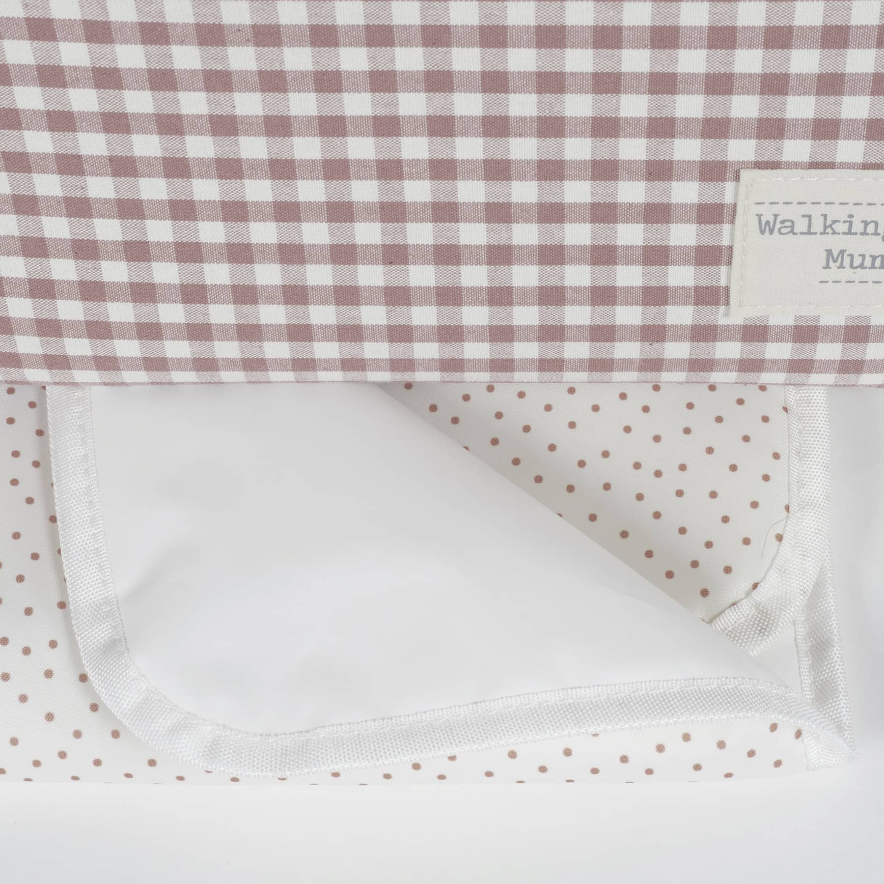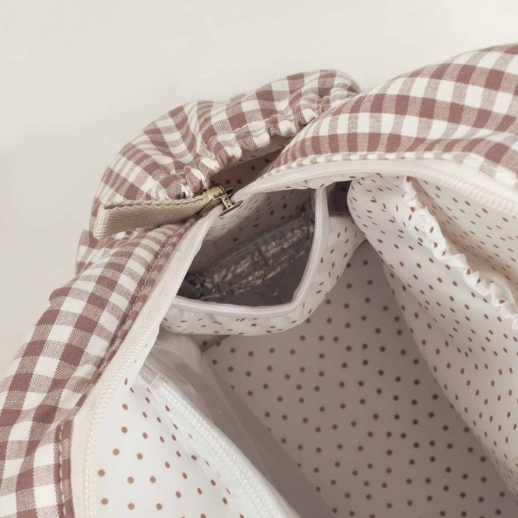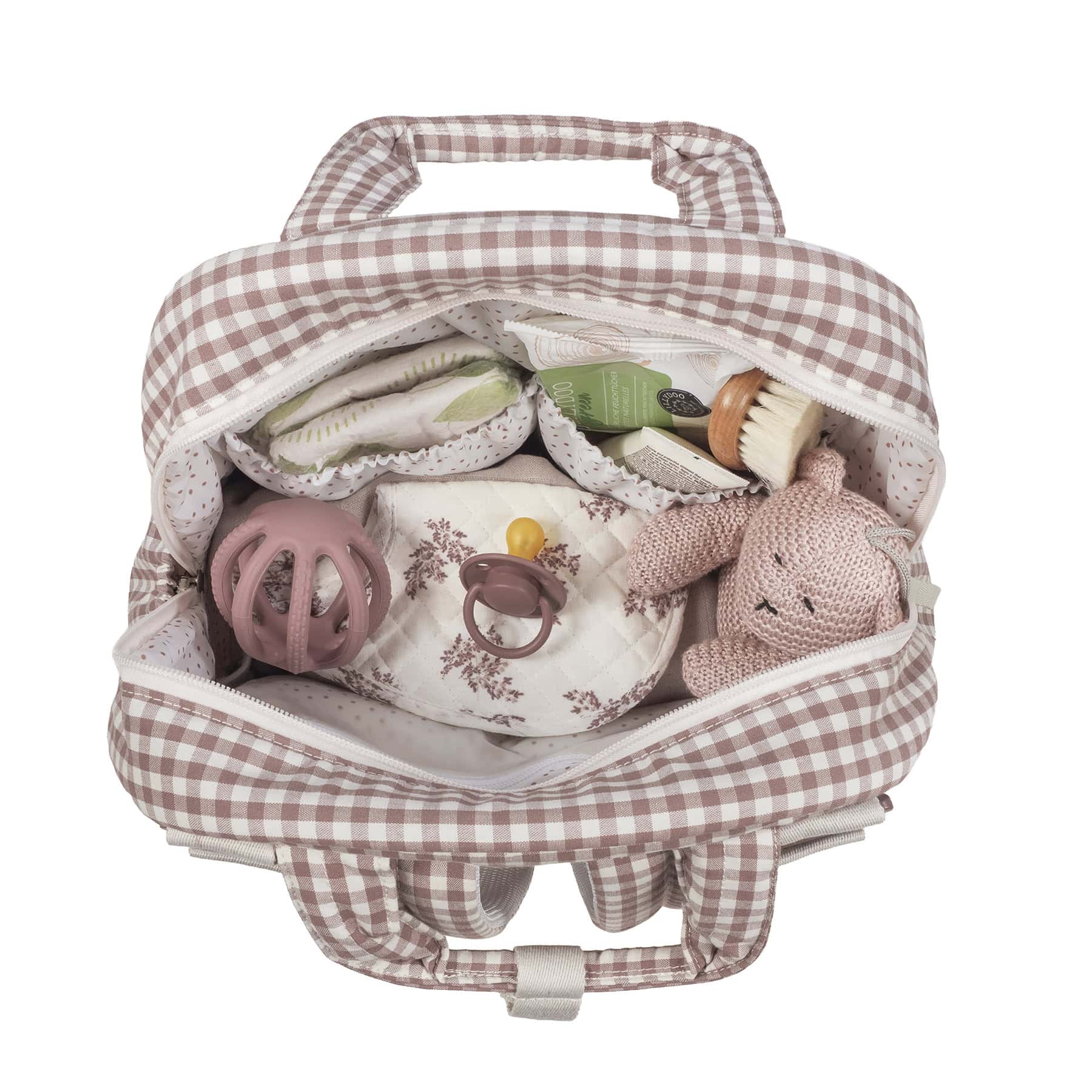 תיק גב לעגלה מושלם לך ולבייבי שלך. תיק בעיצוב משבצות עדין בגווני ורוד חום בקישוט מלמלה עם תאים פנימיים וחיצוניים. מיוצר מבד איכותי ועמיד לנוזלים. לתיק רצועות לנשיאה על הגב.