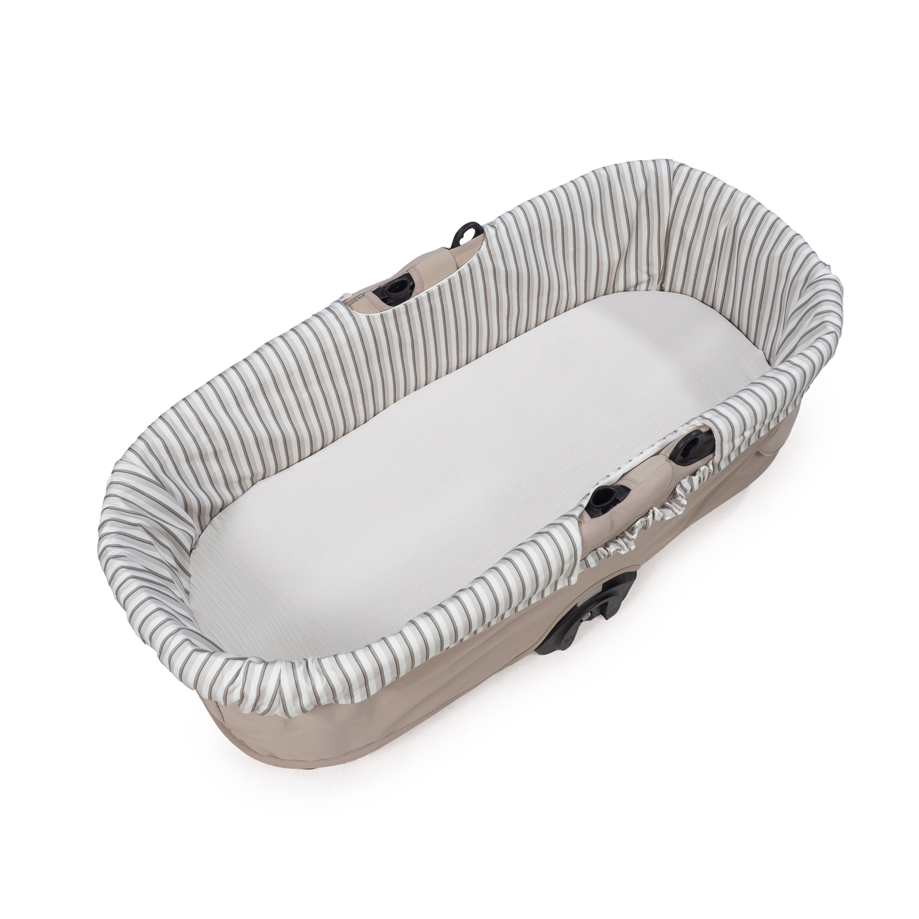 כיסוי לאמבטיה של עגלה מקולקציית BOTTON. בעל הדפס פסים בגוונים עדינים. כולל סט של כיסוי היקפי ומצעים למזרן האמבטיה. 100% כותנה. יש לכבס ידנית או בכביסה עדינה עד 30 מעלות.